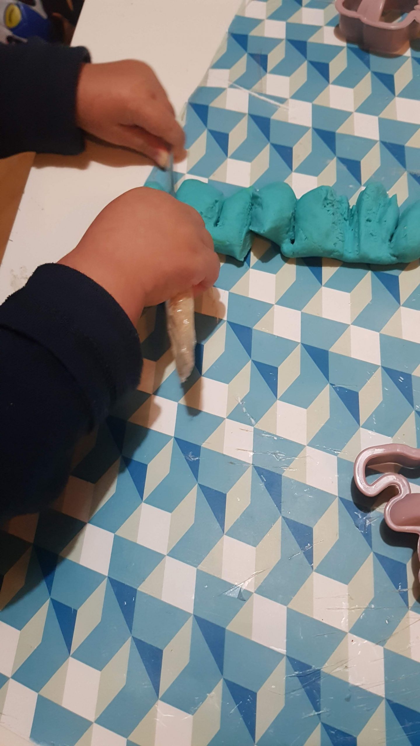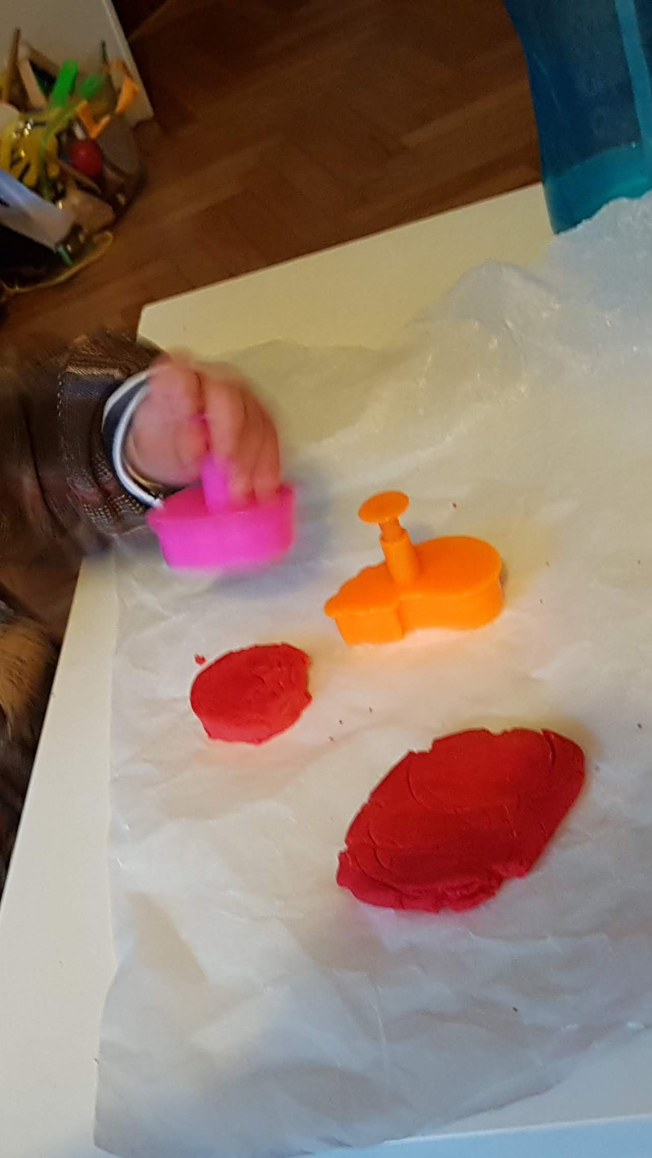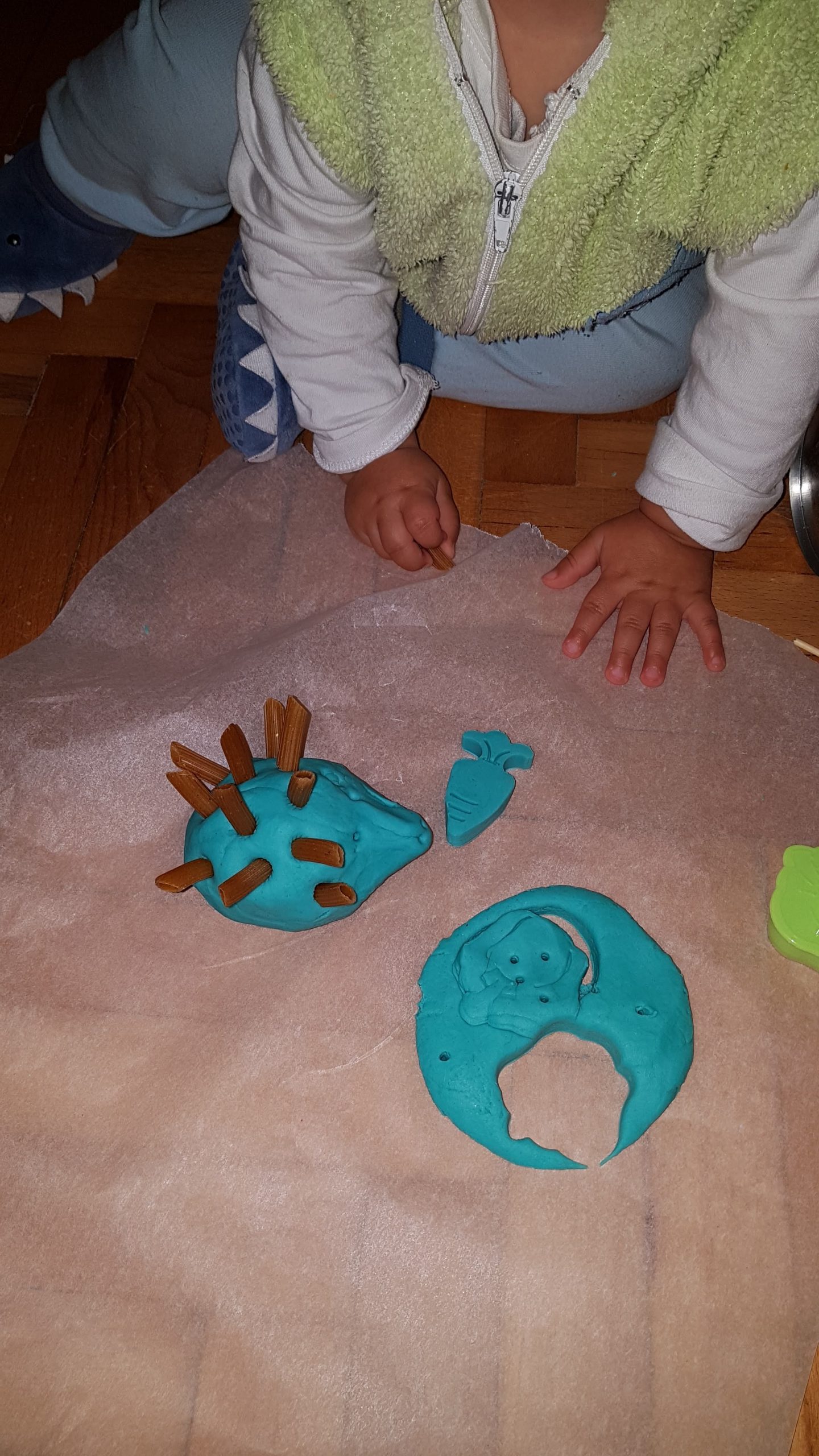 И предполагам всички знаем, че всяка такава дейност развива допълнително фината моторика, координацията око-ръка, среща се с нови тактилни и визуални усещания. А за нас големите е голяма забава – връщаме се в детството и развиваме въображението си. Припомняме си как се прави пате, което в повече случай прилича на жълт крокодил 🙂 Разбира се не на последно място си е доста отпускащо и прогонващо стреса да мачкаш мека тока, която се изцежда между пръстите ти и можеш да я биеш в масата?! Яко нали?!