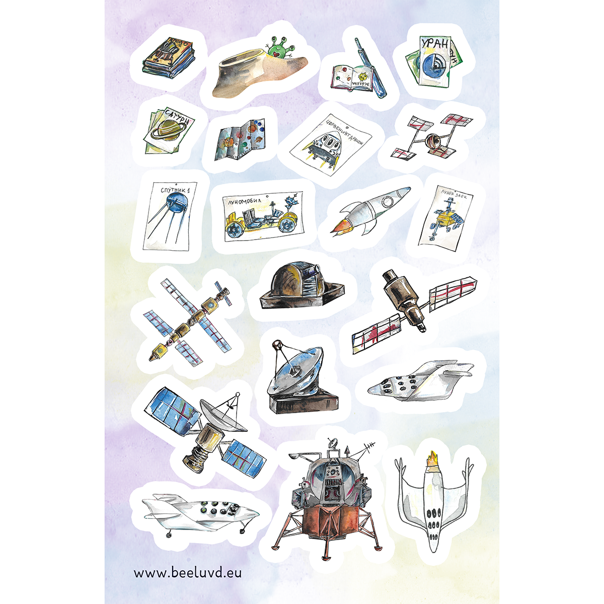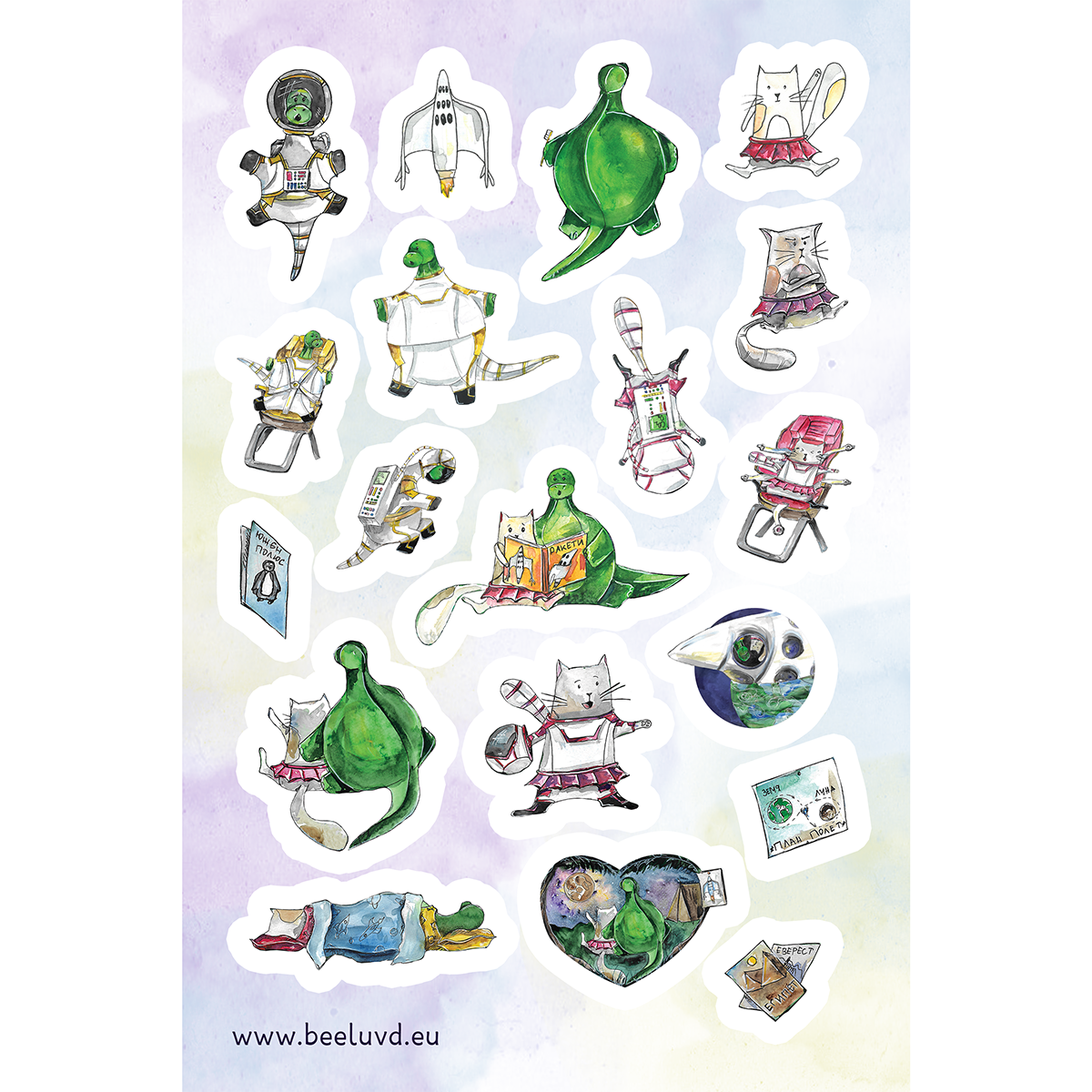 В комплекта ще откриете 85 стикера с двамата герои в различни пози и ситуации, както и стикери на различни космически обекти и машини.
